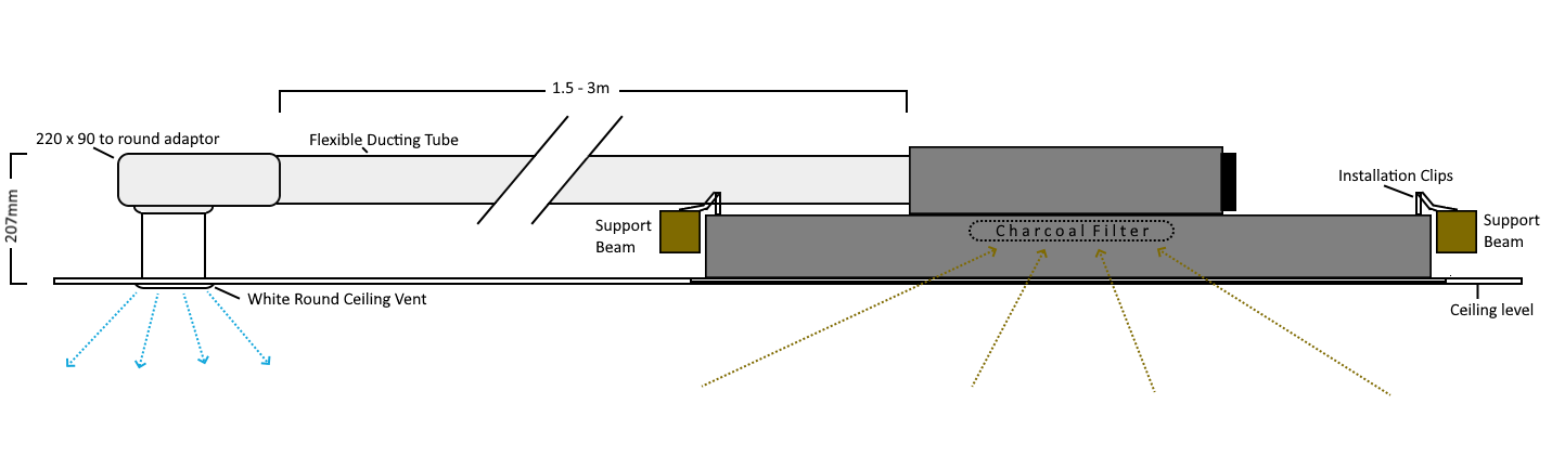 Using 220 x 90cm rectangular (equivalent to 6″) ducting to maintain ease of fitting in the ceiling void (the 90mm height fits easily), you can simply duct straight to the wall and use a rectangular outlet, or convert to 150mm round for sourcing draughtproof or insulated ducting systems. The recirculation version comes with a ducting kit and everything you need to get started.